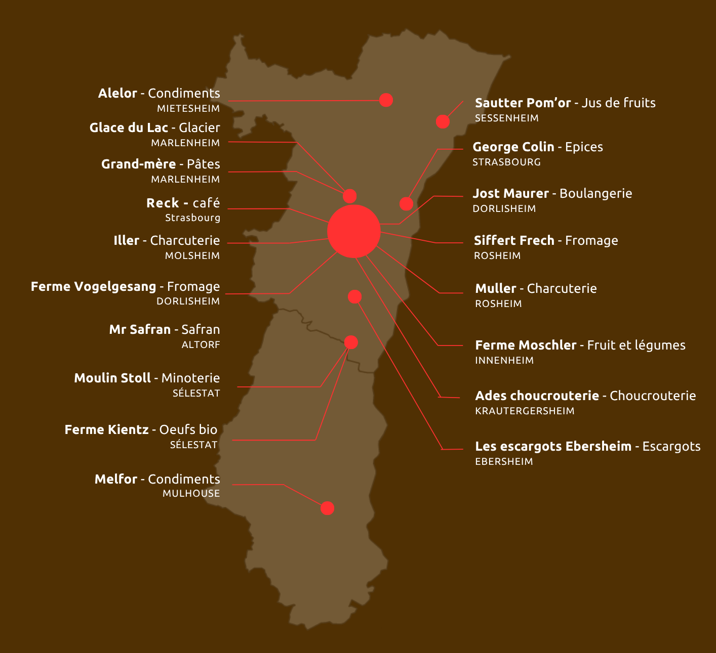 Fromages affinés, charcuteries d’Alsace, volailles fermières, épices du terroir, farines de notre minoterie partenaire, choucroutes artisanales, pains de notre boulanger, fruits et légumes de saison : chaque ingrédient est sélectionné avec soin pour garantir fraîcheur, qualité et authenticité.